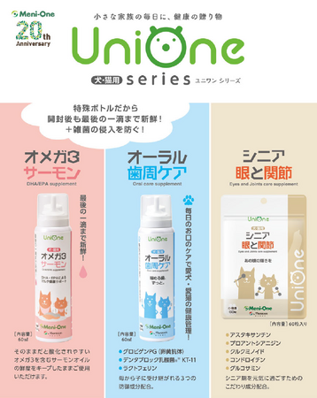 「UniOne」シリーズの新商品は、1.DHA・EPA配合マルチタイプの「オメガ3サーモン」、2.オーラル歯周ケア用の「オーラル歯周ケア」、3.シニア犬・猫用のサプリメントの「シニア眼と関節」の3商品をラインアップしました。