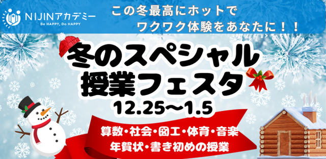 日本中の学校をハッピーにする株式会社NIJIN(本社:東京都江東区、代表取締役:星野達郎)が運営する小中学生向けオンラインスクール「NIJINアカデミー」は、12月25日から1月5日の期間で「冬のスペシャル授業」を開催します。