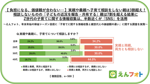 労働力不足問題解決のリーディングカンパニーとして、複数のSaaSを展開する株式会社うるる(東京都中央区 代表取締役社長:星 知也)が運営する、保育園・幼稚園向けのオンライン写真販売サービス「えんフォト」は、年末年始の帰省シーズン目前に、未就学児をもつ20代から40代の親500名を対象とした「子育てに関する情報収集と親世代との価値観の違いに関する調査」を実施いたしました。