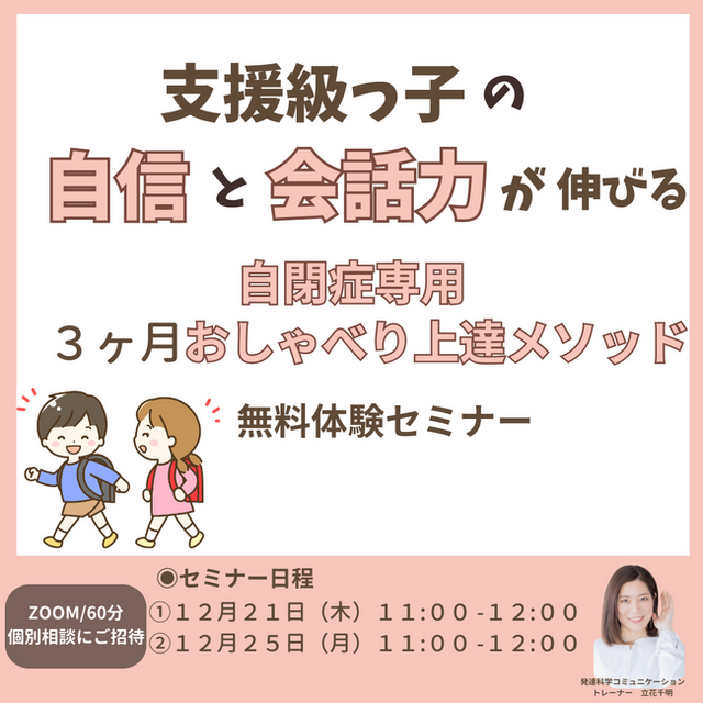 この度は、『支援級っ子の自信と会話力が伸びる自閉症専用3ヶ月おしゃべり上達メソッド体験セミナー』募集スタートいたします。