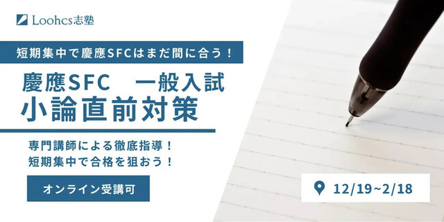 毎年慶應義塾大学に多くの合格者を輩出するルークス志塾で、慶應義塾大学SFC一般入試に向けた小論直前対策講座を実施します。本講座では、合格に結びつく圧倒的な”論述力”を身につけることを目指します。また、専門の講師があなたの進捗状況を把握し、合格までのフォローを致します。SFCの一般小論文に求められる”論述力”と”問題発見解決力”を身につけて、共に合格を勝ち取りましょう!
