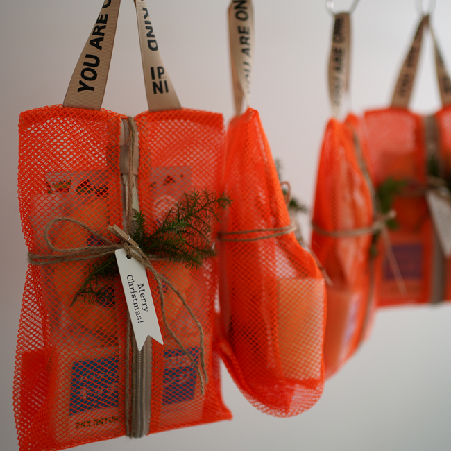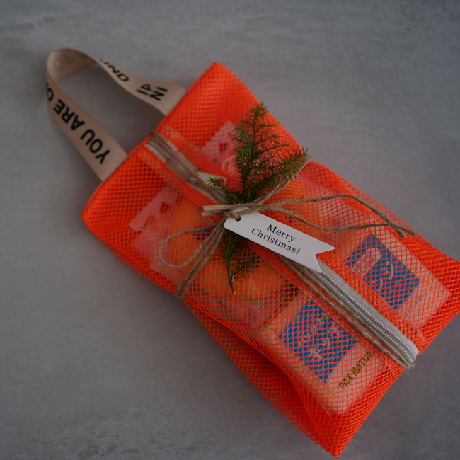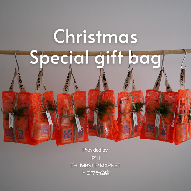 THUMBS UP MARKET(サムズアップマーケット)からはテイクアウトでも大好評のデザインもかわいい特製クッキー、トロマチ商店からはリピーター続出の泡立ち水切れ抜群のキッチンスポンジ&パッケージデザインが秀逸なドリップコーヒーをIPNI(イプニ)で大人気のオリジナルメッシュバッグに入れた特別仕様のクリスマス限定コラボギフトバッグです。