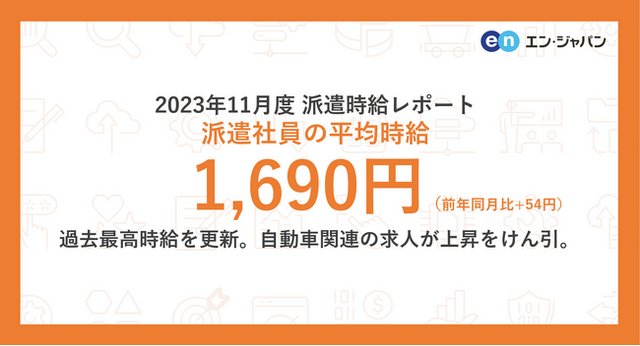 2023年11月度の三大都市圏平均時給は1,690円(前月比+11円・0.7%増、前年同月比+54円・3.3%増)で、3ヵ月ぶりに過去最高時給を更新しました。平均時給の上昇には「自動車の生産台数の増加」が影響しています。