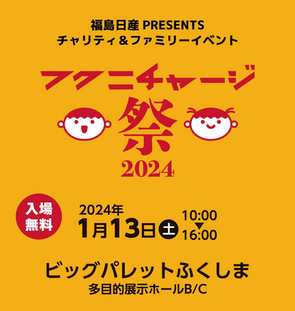 福島日産自動車株式会社(本社:福島県福島市、代表:金子 與志幸)は、福島日産 PRESENTS チャリティ&ファミリーイベント 「フクニチャージ祭2024」を2024年1月13日(土)にビッグパレットふくしまにて開催します。今回もスペシャルゲストや企画が盛りだくさん!収益の一部はフクニチャージこども基金を通して、福島県内で活動している子供支援団体等に寄付をいたします。福島日産のお客様の感謝祭としても力を入れています。お待ちしています!今回は福島日産の初売りラストスパート週での開催となるため、会場にも商談ブースを設け、フクニチャージ祭会場限定 特別ご成約特典もご用意しています。また2023年12月に発表・2024年1月下旬発売予定のNEW日産ノートも会場内に展示されます!