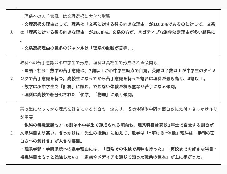 今回の調査を通じてまず分かったこととして、理系に限らず教科への苦手意識は、小中学生で大きく形成されるということです。また、理科は「物理」「化学」など細分化される高校生で躓く傾向なども見られました。