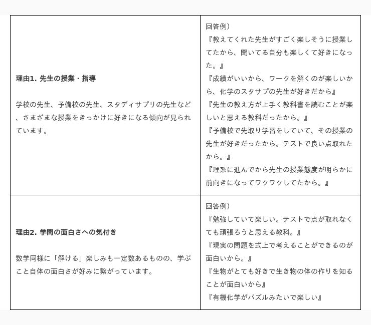 前回調査の結果を受けて、今回は自由記述で文理選択の理由を調査しました。