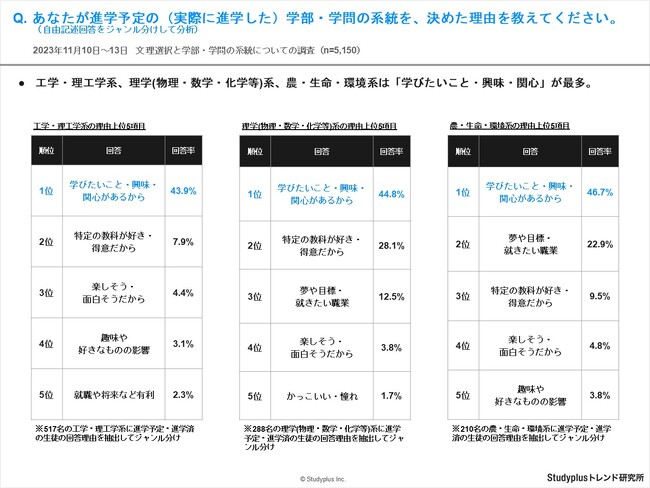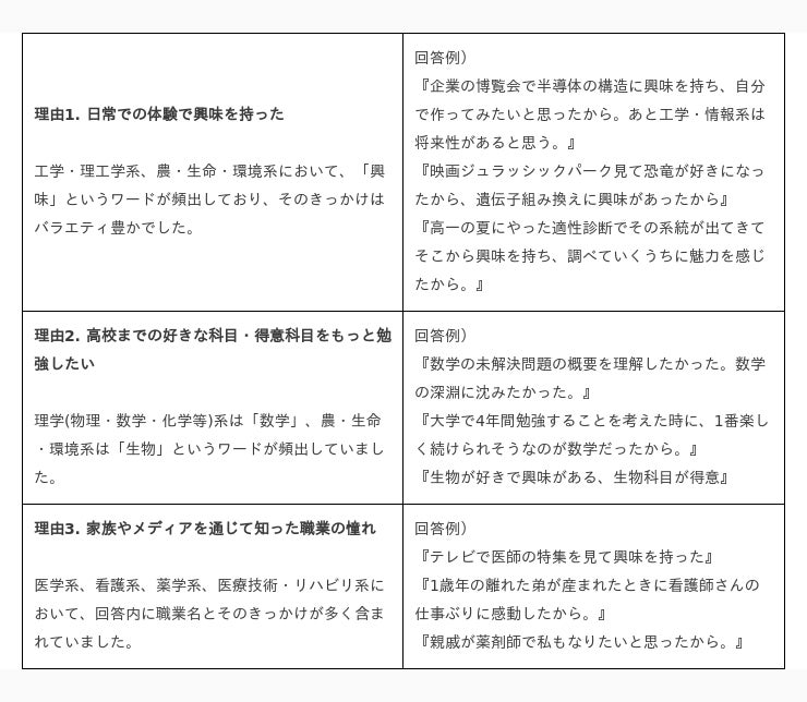 ・頻出ワードに着目すると、理系の学部・学問系統への進学理由として、以下のような傾向が見られました。