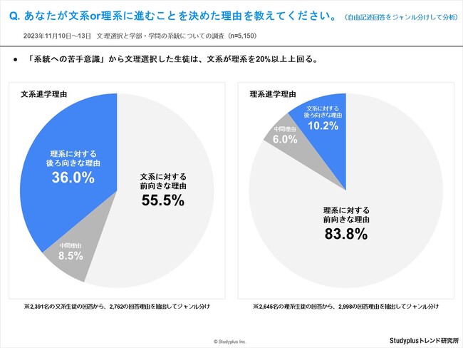 スタディプラス株式会社(本社:東京都千代田区、代表取締役:廣瀬高志、以下スタディプラス)のStudyplusトレンド研究所は、2023年11月10日(金)から11月13日(月)にかけて学習管理アプリ「Studyplus」上で全国の高校生・浪人生・大学1~2年生を対象に「文理選択と学部・学問の系統についての調査」を実施、5,150名から回答を得ましたのでご報告いたします。