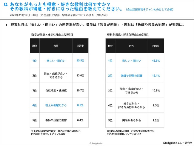 ・理系科目は「楽しい・面白い」回答割合が文系科目よりも高く、数学は「答えが明確」・理科は「教師や授業の影響」といった回答が特徴的です。