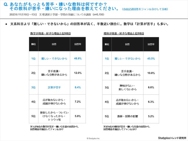 ・理系科目は、文系科目以上に「難しい・できないから」の回答率が高く、半数近い割合。数学は「計算が苦手」も多く見られる結果となりました。