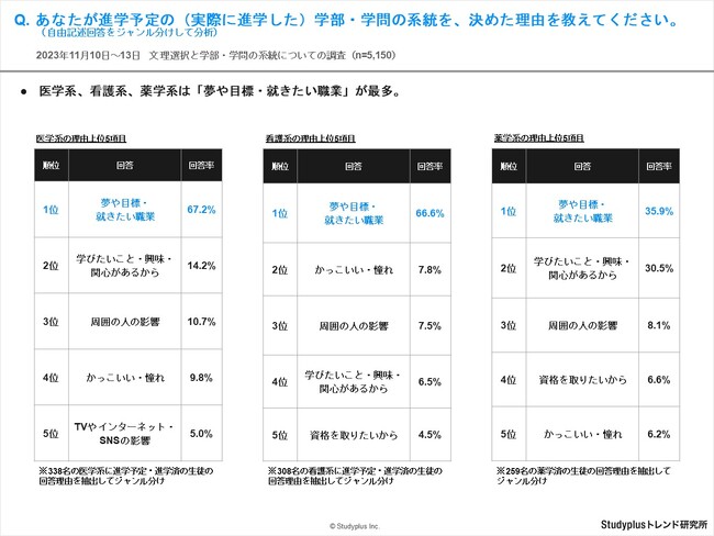 ・理系の学部・学問系統の結果に着目すると、工学・理工学系、理学(物理・数学・化学等)系、農・生命・環境系は「学びたいこと・興味・関心」が最多。医学系、看護系、薬学系は「夢や目標・就きたい職業」が最多という結果が得られました。
