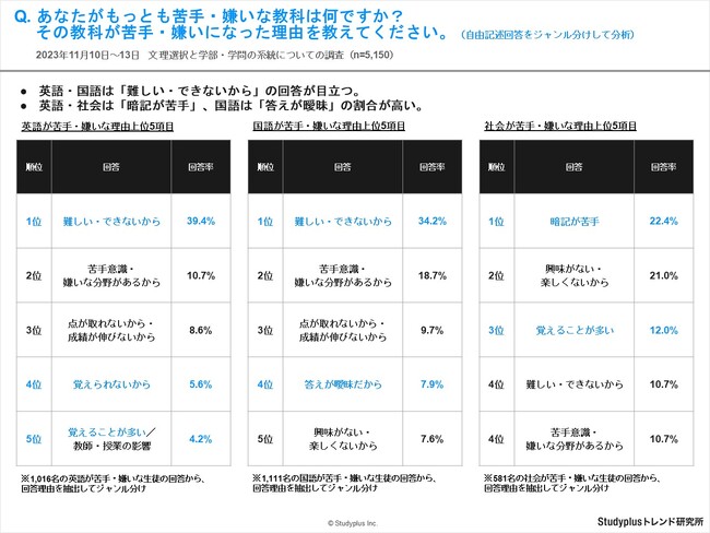 ・英語・国語は「難しい・できないから」の回答が目立ち、英語・社会は「暗記が苦手」、国語は「答えが曖昧」の回答率が高い結果となりました。