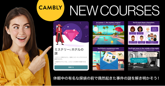 2023年8月に追加されたカリキュラムコース「ミステリー:ホテルの謎」はCamblyとしては初のゲーム要素を加えたカリキュラムになります。リリース以来、受講者様そして講師からご好評いただいているカリキュラムの一つです。休暇中の有名な探偵の前で偶然起きた事件の謎を解き明かしていく合計11レッスンの英語レベル中級向けコースになります。