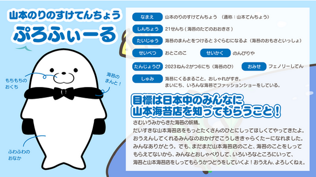 株式会社山本海苔店(本社:東京都中央区/代表取締役社長:山本貴大)は、2023年2月6日に発表した山本海苔店公式マスコットキャラクターの名前を中央区立常盤小学校の子どもたちから募集し、「山本のりのすけてんちょう」通称:山本てんちょうに決定いたしました。今後弊社のキャラクターとして宣伝活動に使用して参ります。