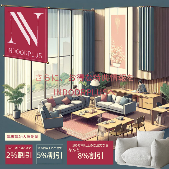 お客様への感謝の気持ちを込めて、INDOORPLUS初の年末年始大感謝祭を開催いたします!新しい年に向けて、素晴らしい家具とインテリアアイテムをお得に手に入れる絶好のチャンスです。セールの詳細について、ご案内いたします。