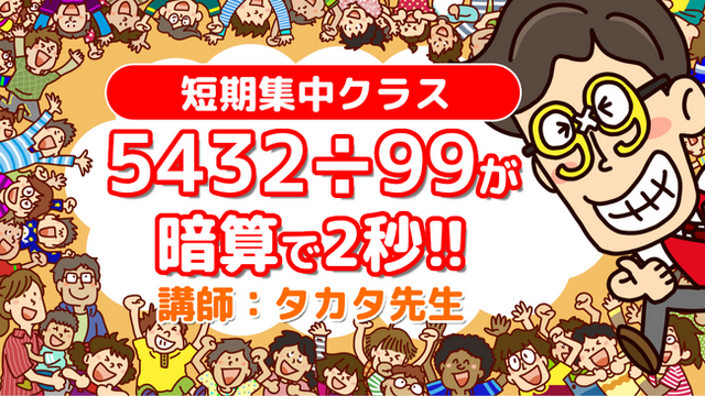 毎週水曜夜に開講している月額クラス「タカタ先生の算数わくわく探検隊」で、1か月で学んだ内容を、休憩ありの3時間にまとめたスペシャルクラス。