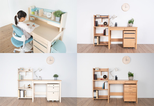 「色を楽しむ」がコンセプトのデスク、ジョイカラーには同シリーズ初となるバーチ材天然木を使用し、定番の学習机である「ベーシックデスク」と、書棚・デスク・ワゴンがセットになった「ユニットデスク」の2タイプが登場。