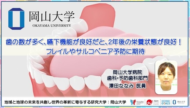 国立大学法人岡山大学(本部:岡山市北区、学長:那須保友)の岡山大学病院歯科・予防歯科部門の澤田ななみ医員、岡山大学学術研究院医歯薬学域予防歯科学の江國大輔教授らの研究グループは、高齢者において、現在歯数が多く、嚥下機能が良好であると、2年後の栄養状態が良好であることを明らかにしました。