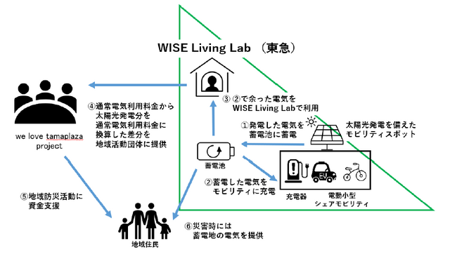 東急田園都市線たまプラーザ駅北側に位置する、次世代郊外まちづくりの活動拠点「WISE Living Lab」に太陽光発電設備、蓄電池、モビリティ充電器などを設置し、発電した電力を活用して電動小型シェアモビリティを充電する創エネルギーの取り組みによるCO2排出量削減と、発電した電力を災害時の電力供給にも活用することで、地域の防災力向上を目指します。