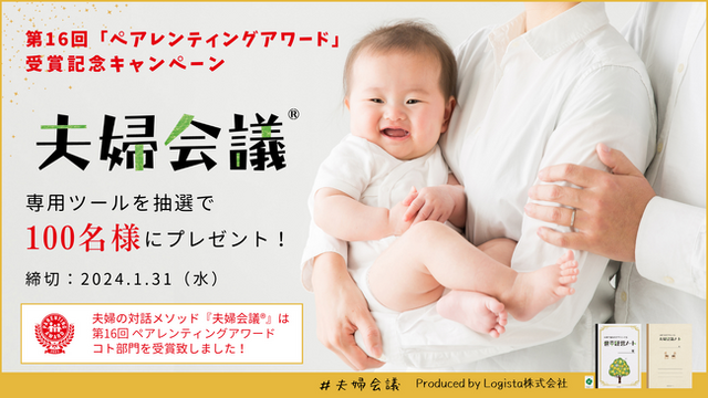 Logista株式会社(福岡県福岡市、共同代表 長廣百合子(妻)・長廣遥(夫))が展開する、日本初(※1)の夫婦の対話メソッド『夫婦会議(※2)』が、人気育児雑誌が選ぶ子育てトレンド「第16回 ペアレンティングアワード/コト部門」を受賞いたしました。