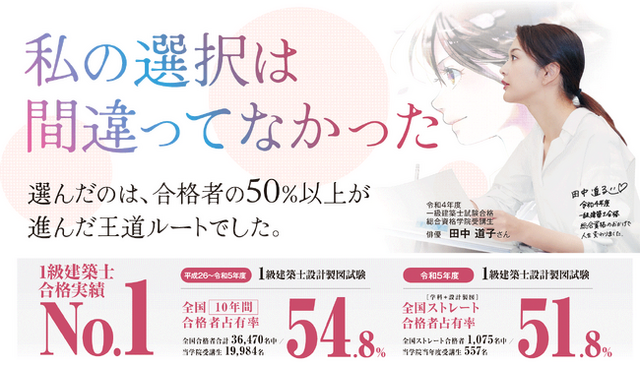 また、令和5年度1級建築士試験において、学科試験と設計製図試験を1年で突破した方の2人に1人以上(注2)を当学院当年度受講生が占め、「日本一」の合格実績を達成しています。