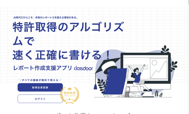 「classdoor」は、この課題に焦点を当て、「文章力」と「論理的思考力」を強化することに注力しています。そのため、レポートの迅速な作成だけでなく、将来に必要なスキルの獲得もサポートしています。これにより、学生たちは効率的にレポートを作成するだけでなく、重要なスキルも同時に身につけることができます。