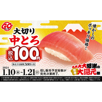 祝!新春!今年もお客さまの笑顔のために精一杯!脂と赤身のバランスが良く、口の中で脂がとろけだす“中とろ”を大切りそれも税込100円でご提供!『大大大大感謝の新春大還元祭』を開催!