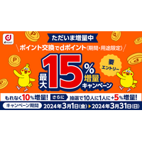 「ポイント交換でdポイント最大15%増量キャンペーン ~もれなく10%増量!さらに抽選で10人に1人+5%あたる~」を開催