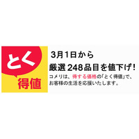 コメリは、得する価格の「とく得値」で、3月1日から厳選248品目を値下げ!