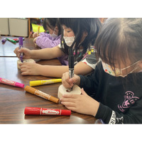 学童保育の子供たちが、身近な女性に向けた感謝のメッセージをヒノキ入浴木に記入します。 株式会社温…