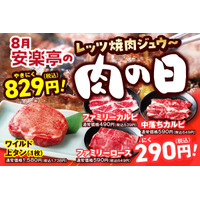 夏休みの〆は安楽亭の肉の日で焼肉ジュウ~しよう!人気の焼肉カルビやロースが290円(税込)!キッズメニュー3種が29円(税込)!さらに!極厚タン「ワイルド上タン」が829円(税込)で登場。