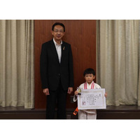 高槻市立芝生小1年の田中結さんが日本拳法の全国大会出場を市長に報告