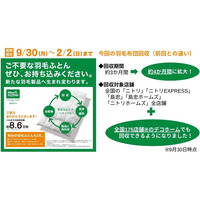 【ニトリの羽毛布団回収】全国のニトリで9月30日(月)より期間限定で実施!他社の羽毛布団もOK!ニトリポイントのプレゼントも。
