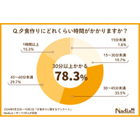 78.5%の方が「夕食作りに30分以上時間がかかる」と回答。「時短・簡単」、「食材の使い切り」、「献立決め」が夕食作りのカギ!