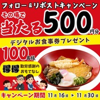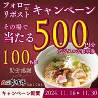 【家族亭】11/16(土)~その場で「デジタルお食事券500円分」が100名様に当たる!Xフォロー&リポストキャンペーン開催!