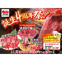 【まるよし精肉店-誕生4周年祭-】国産牛カルビ&上焼肉盛り合わせが半額、まるよし盛り29%OFF、17時までドリンク半額|11月限定で開催