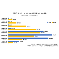 大学キャリアセンターの学生キャリア支援における調査【大学調査】 学生がキャリア観醸成に関する取り組みを開始する時期について、「低学年期」を理想とする大学は7割超