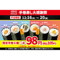 平日限定!お買い得!12月16日(月)~「手巻寿し感謝祭」開催!手巻寿しの限定6種類を【特別価格】98円!(税込105円)で販売します!