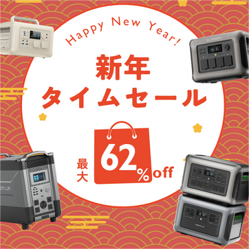 新しい年に相応しい最新テクノロジー搭載のポータブル電源が最大62%OFFとなります。快適なアウトドア生活を始めるためのアイテムがお得に手に入ります。