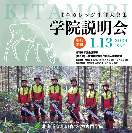 北の森づくり専門学院(略称:北森カレッジ)では、令和6年度の生徒募集をしています。