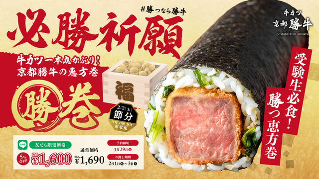 株式会社ゴリップ(本社:京都府京都市)が展開する「牛カツ京都勝牛」は、2月3日(土)の節分に向けて、受験や仕事のゲン担ぎにぴったりな牛カツ恵方巻き「勝巻」を発売致します。