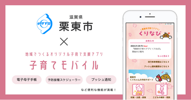 自治体向けサービスを開発する株式会社ミラボ(本社:東京都千代田区、代表取締役:谷川一也、以下「ミラボ」)の子育て支援アプリ「子育てモバイル」が、滋賀県 栗東市に導入され、「栗東市子育てアプリ くりなび」として 1月5日より提供を開始します。また、同時にパパママ教室やイベント等のオンライン予約サービスの提供も開始します。