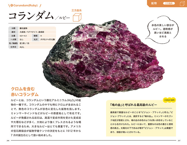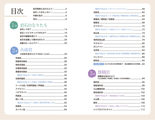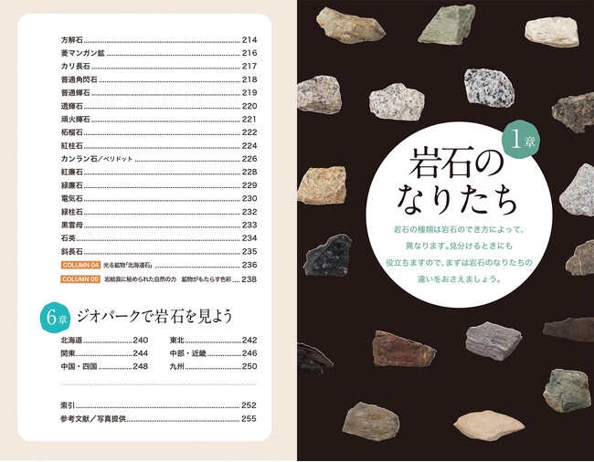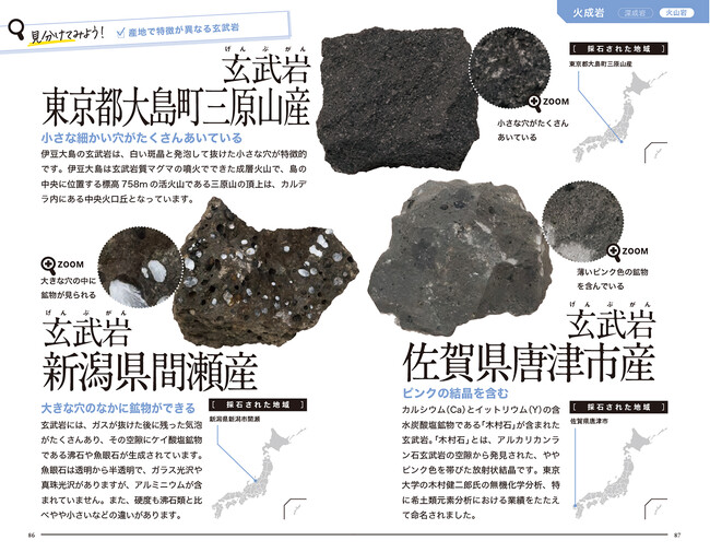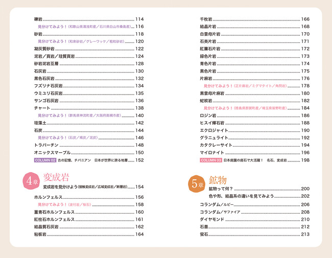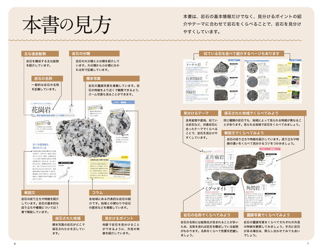 さらに岩石を構成する色鮮やかな鉱物の情報も掲載。岩石の断面写真を元に、どのような鉱物が岩石に含まれているのか、内部の特徴を観察することができます。似ている鉱物は比較できるように構成しています。