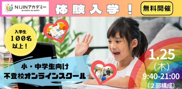 日本中の学校をハッピーにする株式会社NIJIN(本社:東京都江東区、代表取締役:星野達郎)が運営する小中学生向けオンラインスクール「NIJINアカデミー」は、入学を検討されているお子様やご家族を対象に、バーチャル校舎での1日体験入学を1月25日に開催します。