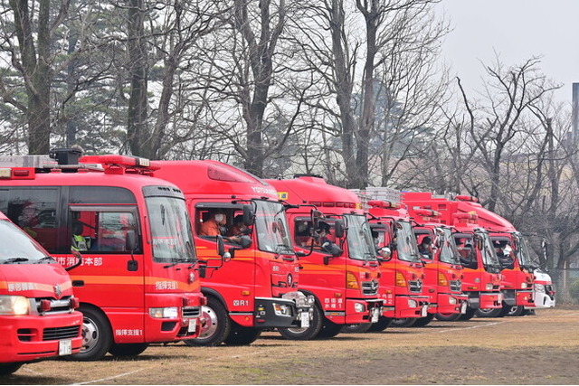 千葉敬愛高等学校マーチングバンド部の先導の元、消防車両による分列行進。