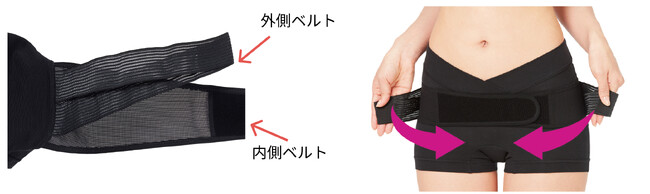 内側の本体ベルトを締めた後に、外側ベルトでサイズ調整を行う2段階構造。2段階のベルト構造だから、体調に合わせて心地よい位置でサポート感と締め加減を調節できます。