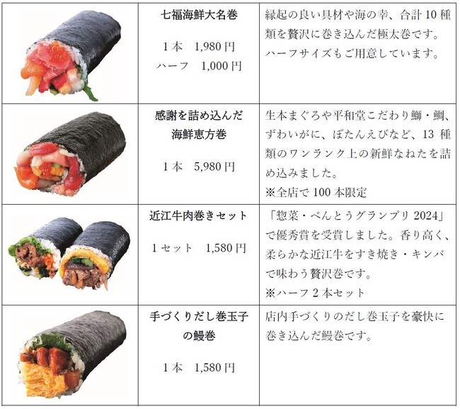 2024年の平和堂の恵方巻は、「日本食糧新聞社主催 ファベックス 第15回 惣菜・べんとうグランプリ2024」の「地方食材・調理法部門」で優秀賞を受賞した「近江牛肉巻セット」や、日頃よりお客様にご好評をいただいている“店内加工のだし巻き”を使った「手づくりだし巻玉子の鰻巻」など、平和堂ならではの商品を新たにラインナップします。