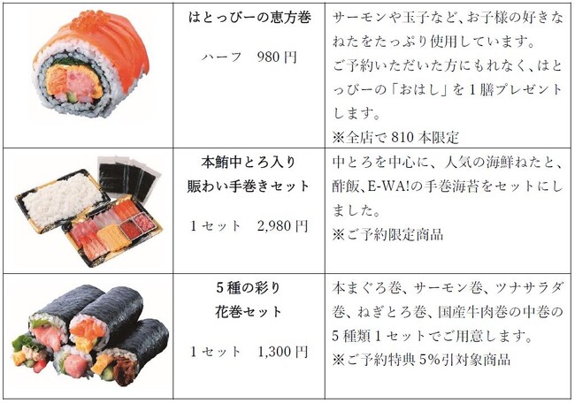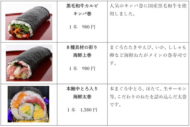 また、ワンランク上の海鮮ねたを贅沢に13種類も使用した「感謝を詰め込んだ海鮮恵方巻」、津軽海峡の天然本まぐろを中心に新鮮なねたを巻き込んだ「津軽海峡天然本鮪と贅沢海鮮恵方巻」など、節分ならではの特別な商品をご予約限定でご用意します。是非お好みの恵方巻をご賞味ください。