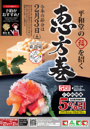 株式会社平和堂(本社:滋賀県彦根市、代表取締役社長執行役員:平松正嗣)は、恵方巻の予約受付を平和堂・エール154店舗で実施しております。