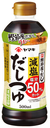 ヤマキ株式会社(本社:愛媛県伊予市 代表取締役社長:城戸善浩、以下 ヤマキ)は、2009年に発売された塩分50%カットの濃縮3倍つゆ「減塩だしつゆ 300ml」の中容量タイプとして「減塩だしつゆ 500ml」を発売します。